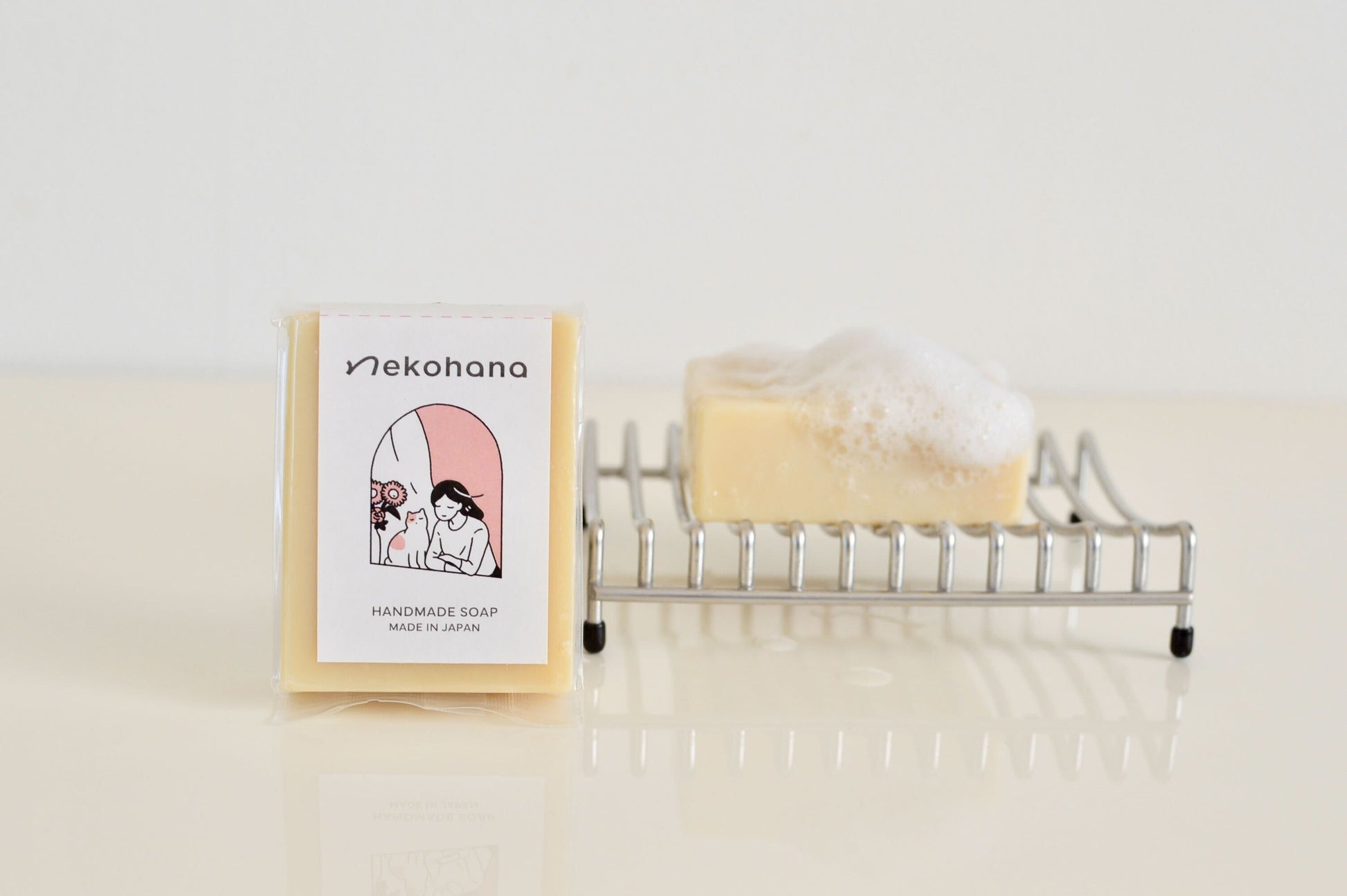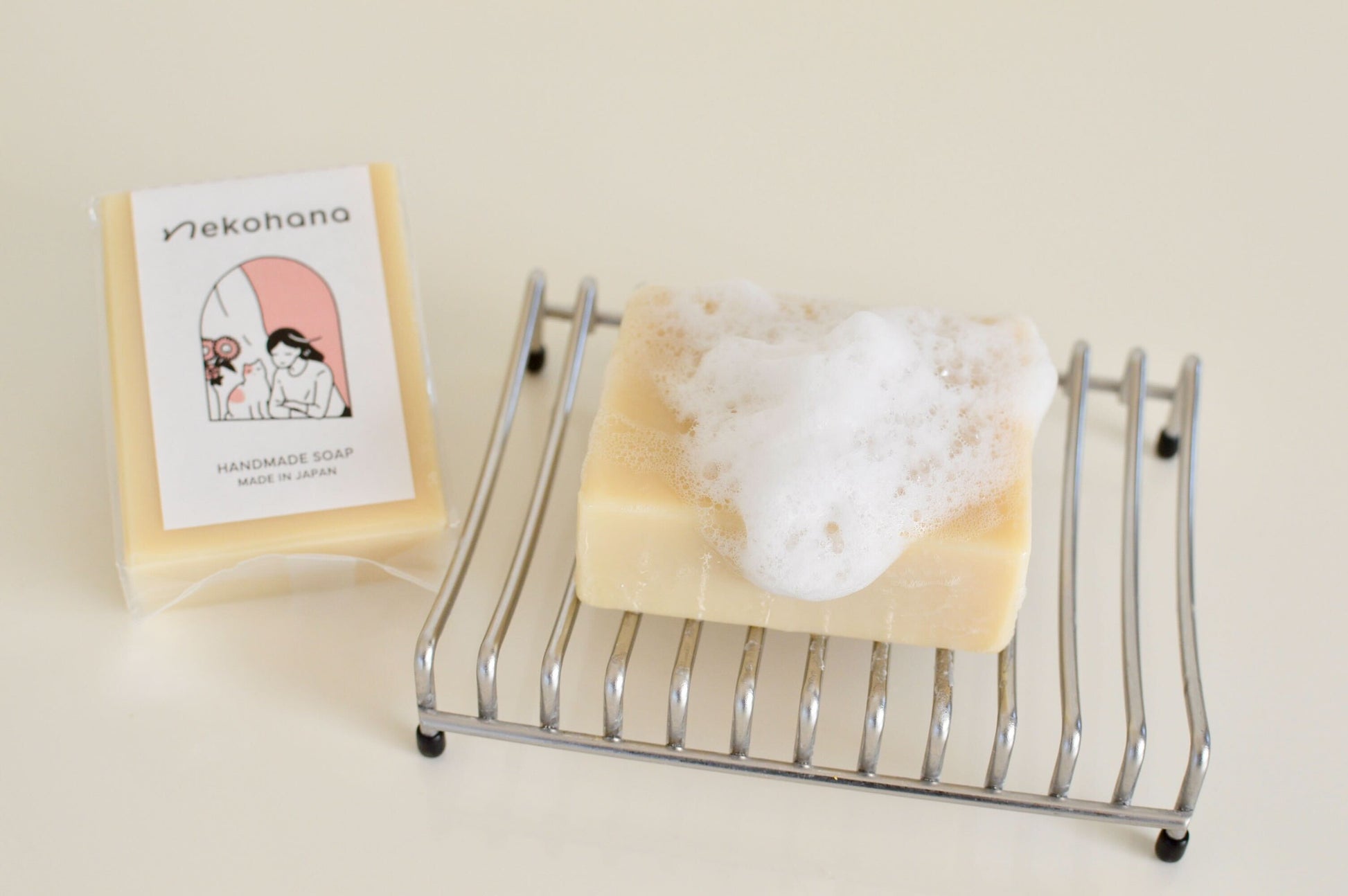 オリーブオイルを主成分とし、植物油のみで仕上げたコールドプロセス製法で、一つひとつ石鹸職人さんが手作りで作成しています。